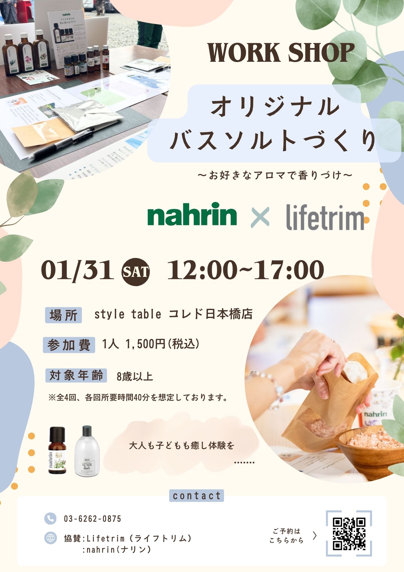 前回ご好評いただきましたstyle tableコレド日本橋店でのLifetrim×nahrinのバスソルトワークショップを開催いたします!