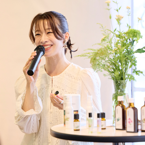 トークショーでは、石井さんが長年ご愛用くださっている『ハーブオイル33+7 ロールオン』の使い方をはじめ、バスエッセンスやボディミスト、ベジタブルブイヨンなど、日ごろからお使いいただいているナリンアイテムのお気に入りポイントを伺いました。