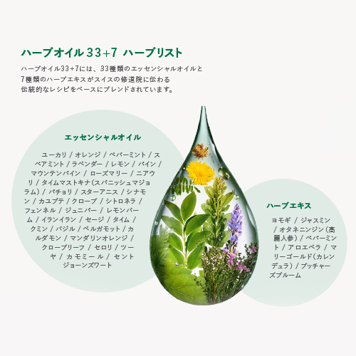 スイスの修道院に中世から伝わるハーブレシピをベースに、33種類の精油と7種類のハーブエキスを配合。肌に直接塗ることができ、不調な部分などセルフケアアロマとしてや香りによる気分転換にもお使いいただけます。