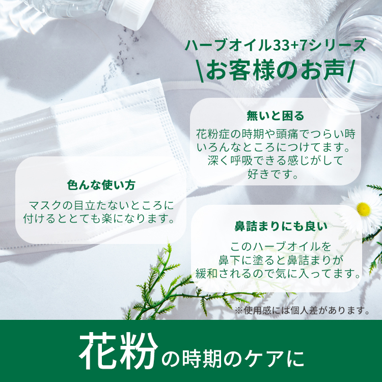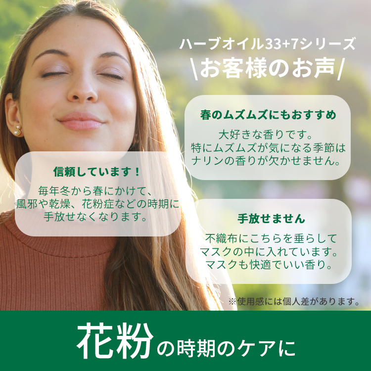 香り、使用感、用途の広さ、全てが理想通りです。オイルより香りはソフトですが、顔周りに使用することが多いので丁度良い感じです。花粉の時期や風邪をひいた時は手放せません。荒れた鼻の周りに塗ってもヒリヒリしないし、ふんわりと香りがして気分も良くなります。
