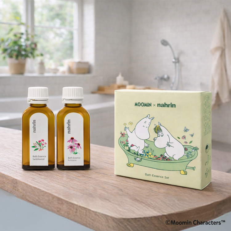 今回限定のオリジナルパッケージでは、ナリンならではのハーブの香りをたのしむ日常を、お風呂をたのしむムーミンたちのやさしい日常に重ね、表現しています。